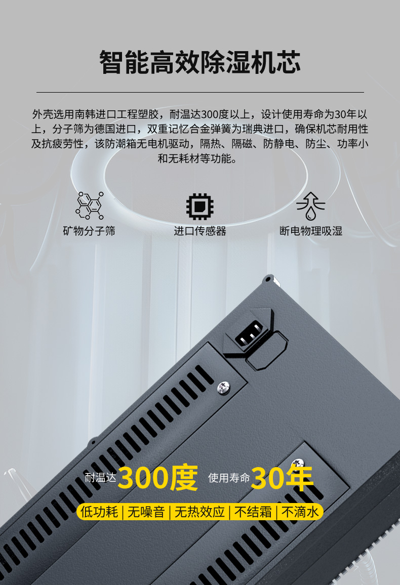 控濕機芯:外殼選用南韓工程塑膠,耐溫達300度以上,設計使用壽命為30年以上,分子篩為德國進口,雙重記憶合金彈簧為瑞典進口,確保機芯耐用性及抗疲勞性; 該防潮箱無電機驅動,隔熱﹑隔磁﹑防靜電﹑防塵﹑防盜﹑功率小和無耗材等功能,因此,該防潮箱具有環保﹑節能﹑靜音﹑無污染、不滴水。